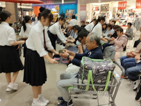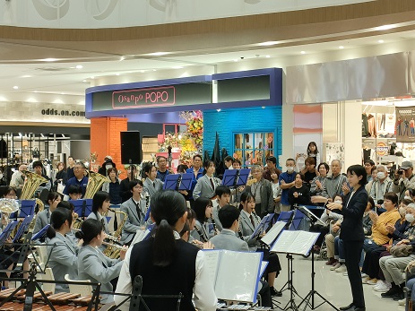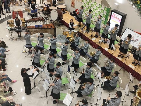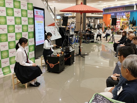 イオンモールとなみで開催された「となみの秋の文化祭10周年祭」に茶道部、吹奏楽部が参加しました。茶道部は和菓子とお茶でお客様をもてなしました。吹奏楽部は館内いっぱいに音楽を響かせ、自然に手拍子がおこりました。