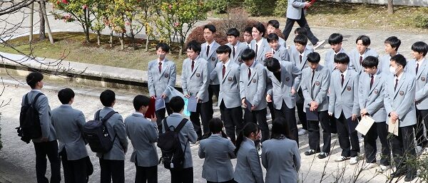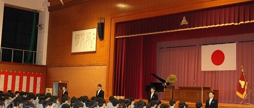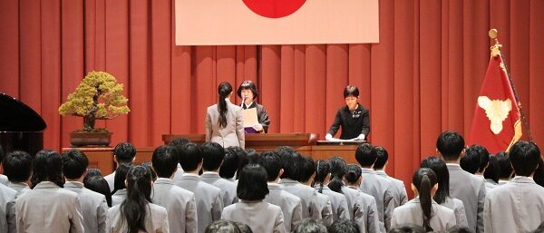 応援旗引継式は前庭で行われ、3年応援団長が3年生に向け感謝の言葉と今後の決意を共有しました。1,2年生に対してはこれからの活躍を願うメッセージを送り、応援旗は2年応援団長に引き継がれました。